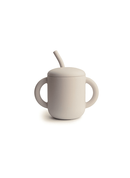 Drinkbeker met rietje Shifting Sand uit de dinnerware collectie van MUSHIE heeft een dubbel handvat, lekvrij & afneembaar deksel en zacht rietje voor baby's tandvlees en peutertanden. De zandkleurige trainingbeker matched perfect met het Mushie bestek, de borden en ander servies.