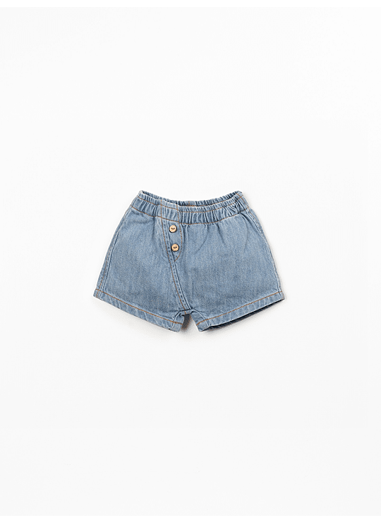 These shorts are made of cotton fabric in Denim color. It is a model with an elastic belt, decorative coconut buttons on the front and a crossed fly detail.